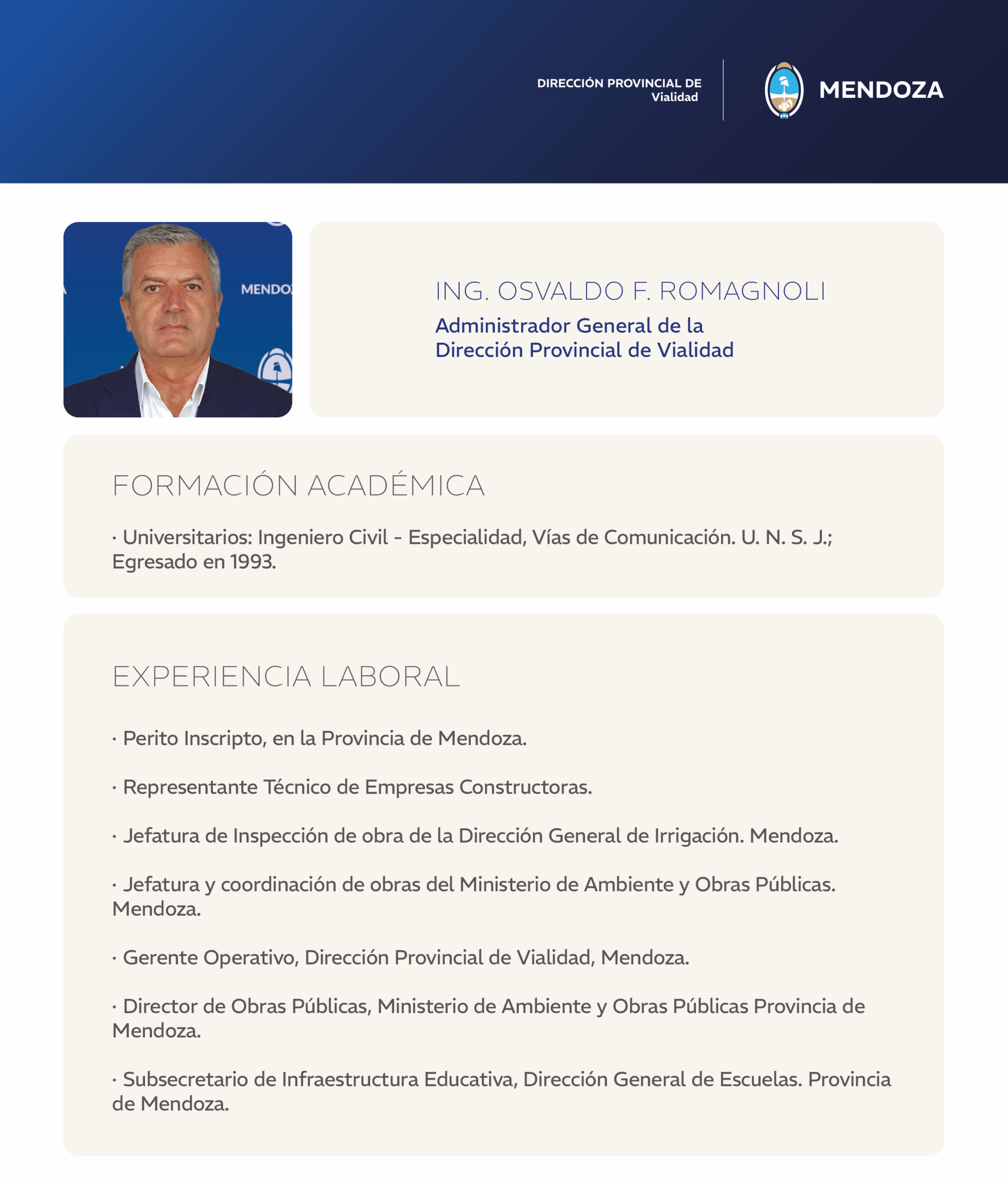 Ingeniero Civil, especialista en Vías de comunicación de la UNSJ. Nació en San Martín, Mendoza, fue Gerente Operativo de la DPV; Jefe de Inspección de Obra de Irrigación; Jefe y Coordinador de Obras y Director de Obras del Ministerio de Ambiente y Obras Públicas; Subsecretario de Infraestructura Educativa de la DGE del Gobierno de Mendoza. Cuenta con una respetada trayectoria en la actividad privada en obras de alto calibre.